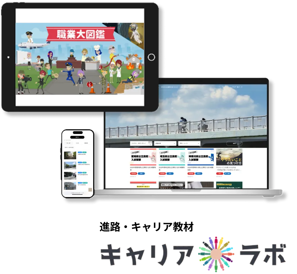 SERVICE サービス一覧 SERVICE1 キャリア・ラボ 進路・キャリア教材 人生を考える、っておもしろいね オトナになった私ってなにをやっているんだろうジブンのこと、トモダチのこと、将来のこと、進学のこと、考えれば考えるほど人生がおもしろくなる FEATURE -4つの教材- 自分と他者を知る「2つの診断」 「性格診断」「キャリア診断」2つの診断結果から、自分や他者の強みや課題を知りさらなる成長へ よのなかの職業を知る「職業大図鑑」 「知らない仕事」から「知っている仕事」に!100種類以上のアニメーション動画と社会でリアルに活躍するオトナたちの記事から学ぶ 上級学校を知る「キャリア・マップ」 「広告なし」「ワークシートとの連動」学校の授業での活用に特化した高校検索サイト高校の検索+ブログ記事が読める 生徒・保護者の生の声を知る「高校見学記録シート」 「高校見学の感想をデータ化」生徒・保護者の感想をデータ化し三者面談等での活用が可能 さらに詳しくはこちら SERVICE2 イノベーター・アカデミー 探究学習プログラム イノベーター・アカデミー 本気のオトナたちから本気の授業を この社会は働くオトナたちの力で成り立っているそんなオトナたちは、どんなことを考え、どんなことをしているのだろう働くオトナたちによる本気の授業を受けてみよう FEATURE -4つの教材- 各業界で活躍する企業が参加 様々な業界で活躍する企業とコラボレーション。各企業とオリジナルに開発した生きた授業をお届け。 生徒の心を揺さぶるカリキュラム 実践を通した学びで、生徒の興味や関心、 可能性を引き出すカリキュラム設計 先生が実施やすい授業設計 単元計画も指導案も弊社が作成するので、 先生方の負担少なく実施が可能 授業前~授業後まで弊社がサポート 弊社が企業と学校をつなぎ、授業の設計から 本番の授業まで弊社の担当者が徹底サポート さらに詳しくはこちら